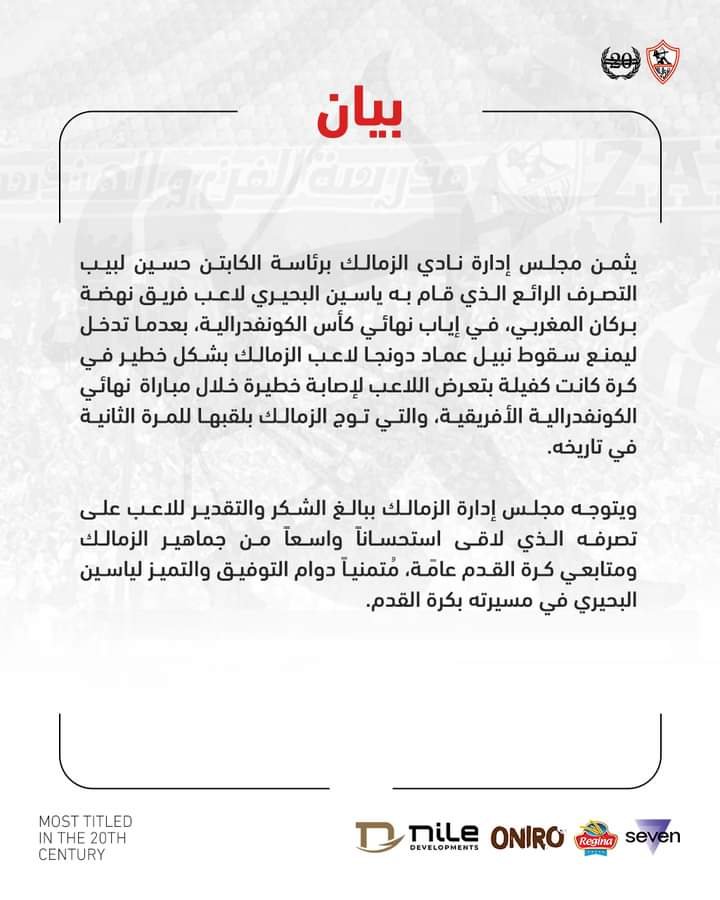 وقال البيان: يثمن مجلس إدارة نادي الزمالك برئاسة الكابتن حسين لبيب التصرف الرائع الذي قام به ياسين البحيري لاعب فريق نهضة بركان المغربي، في إياب نهائي كأس الكونفيدرالية، بعدما تدخل ليمنع سقوط نبيل عماد دونجا لاعب الزمالك بشكل خطير في كرة كانت كفيلة بتعرض اللاعب لإصابة خطيرة خلال مباراة نهائي الكونفيدرالية الإفريقية، والتي توج الزمالك بلقبها للمرة الثانية في تاريخه.