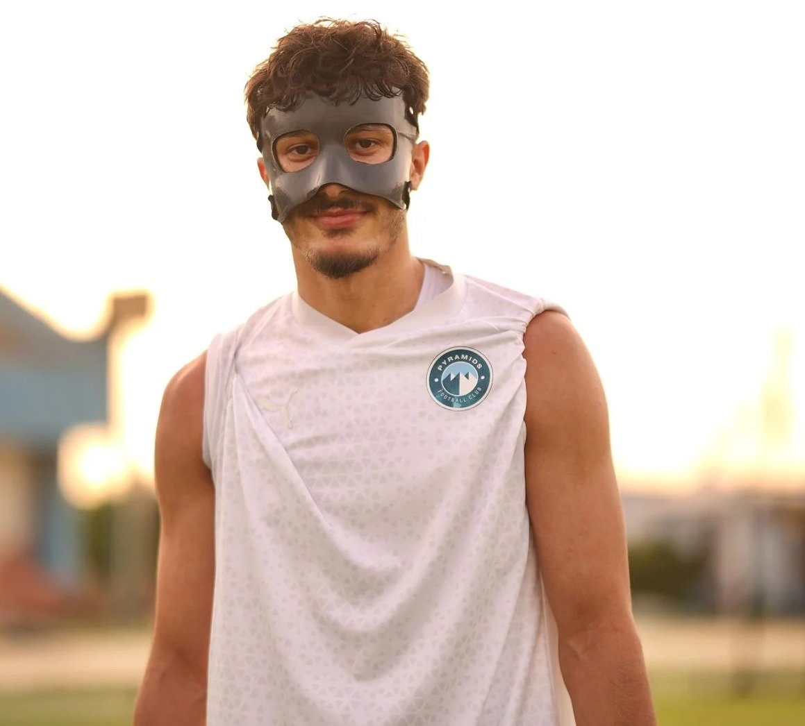 أخبار جديدة تتعلق بأسامة جلال، مدافع نادي بيراميدز، حيث ظهر يرتدي قناعًا طبيًا في تدريبات الفريق بعد إجرائه لعملية جراحية في الوجه بسبب كسر في العظام خلال مباراة سابقة في الدوري الممتاز.