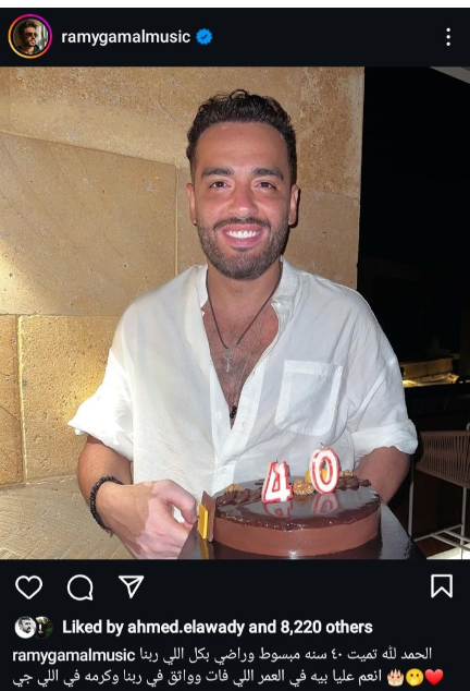 شارك الفنان رامي جمال جمهوره خلال الساعات الماضية، مظاهر احتفاله بعيد ميلاده الـ 40 عبر حسابه الشخصي على انستجرام، وقام بنشر صورة له من الإحتفال معلقاً عليها: " الحمدلله تميت 40 سنة مبسوط و راضي بكل الي ربنا انعم عليا بيه في العمر الي فات مضيفاً : " واثق في ربنا وكرمه في الي جاي ".
