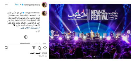 ونشر رامي جمال صورًا من الحفل، معلقًا " من حفل الأمس الأكثر من رائع حضور وتنظيم وجمال مسرح وهندسة صوت وجمهور راقي في مهرجان العلمين شكراً لبلدنا العظيمة وشكراً لشركتي المتحدة وتذكرتي على كل التفاصيل .. تشرفت بالعمل معاكم شكراً لكل حد كان سبب اني انبسط امبارح".