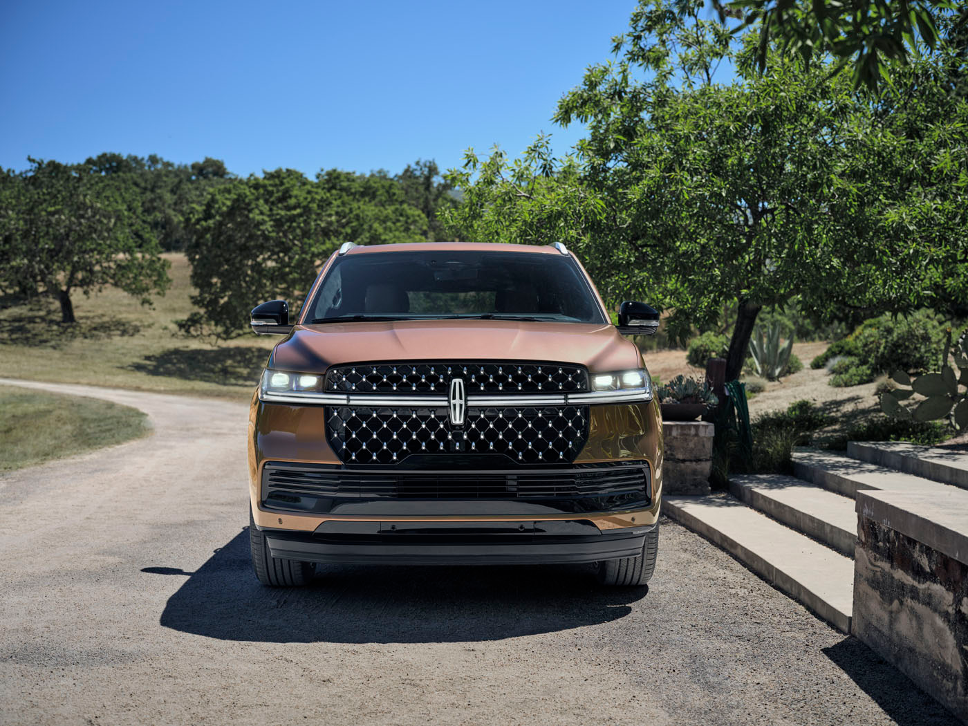 تبرز السيارة بشبكة أمامية ضخمة مزودة بفتحات تهوية واسعة، إلى جانب مرايات جانبية مزودة بإشارات ضوئية، وشعار NAVIGATOR البارز على الجانب.
