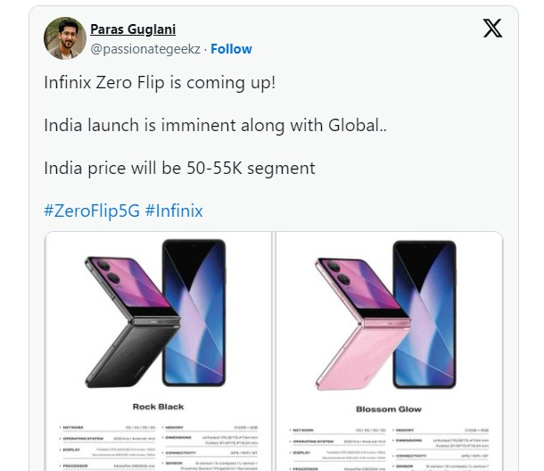 كشفت تسريبات جديدة عن هاتف Infinix Zero Flip المنتظر من شركة إنفينيكس، الذي يعد إضافة مثيرة لسوق الهواتف القابلة للطي. ورغم عدم الإعلان الرسمي عن موعد الإطلاق، فإن التسريبات التي نقلها Paras Guglani تسلط الضوء على مواصفات الجهاز المنتظر.